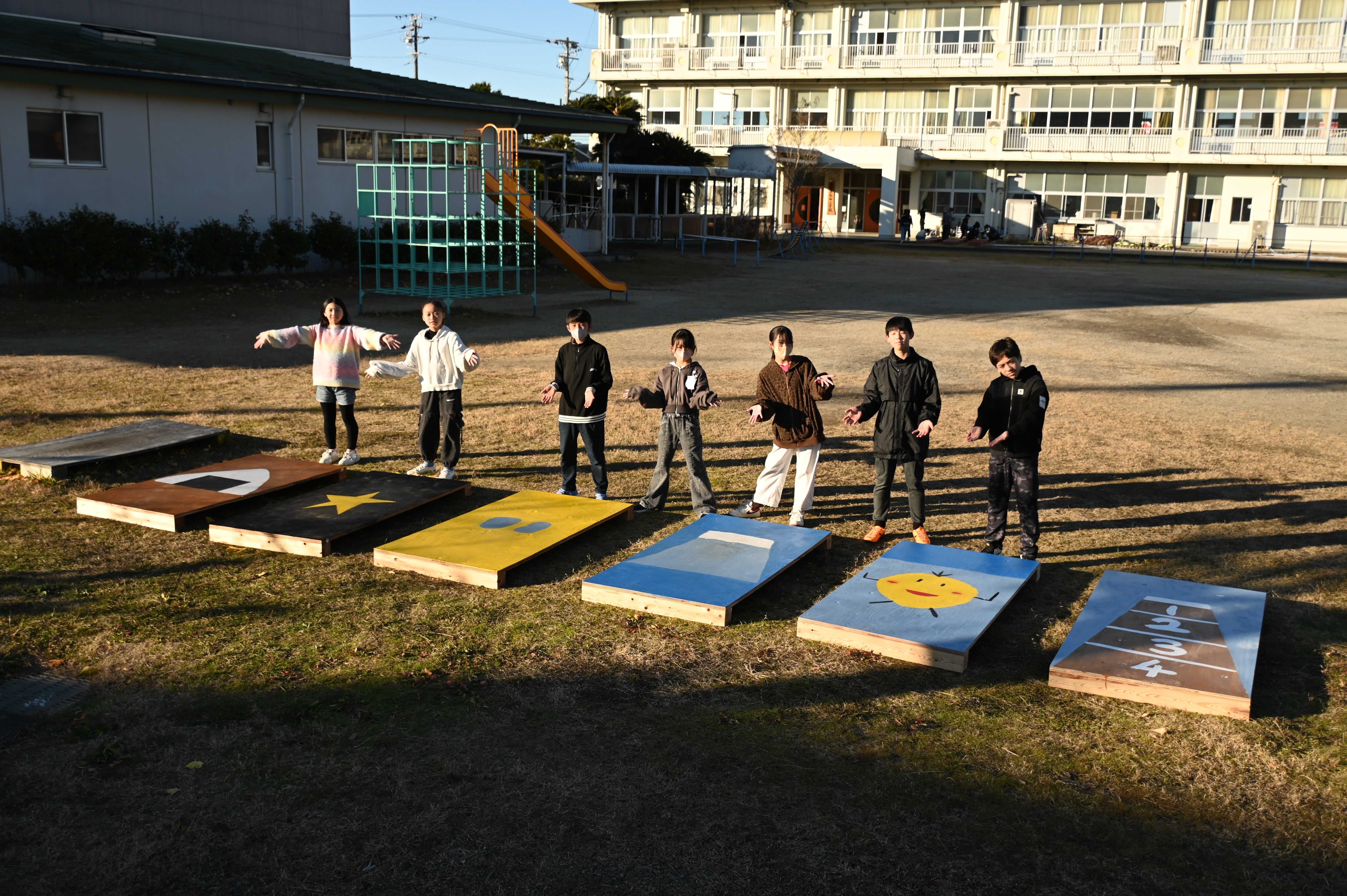 2025年12月15日 16時30分全校の子供たちになわとびの練習に使ってもらうために、体育委員会でジャンピングボードの色塗りをしました。