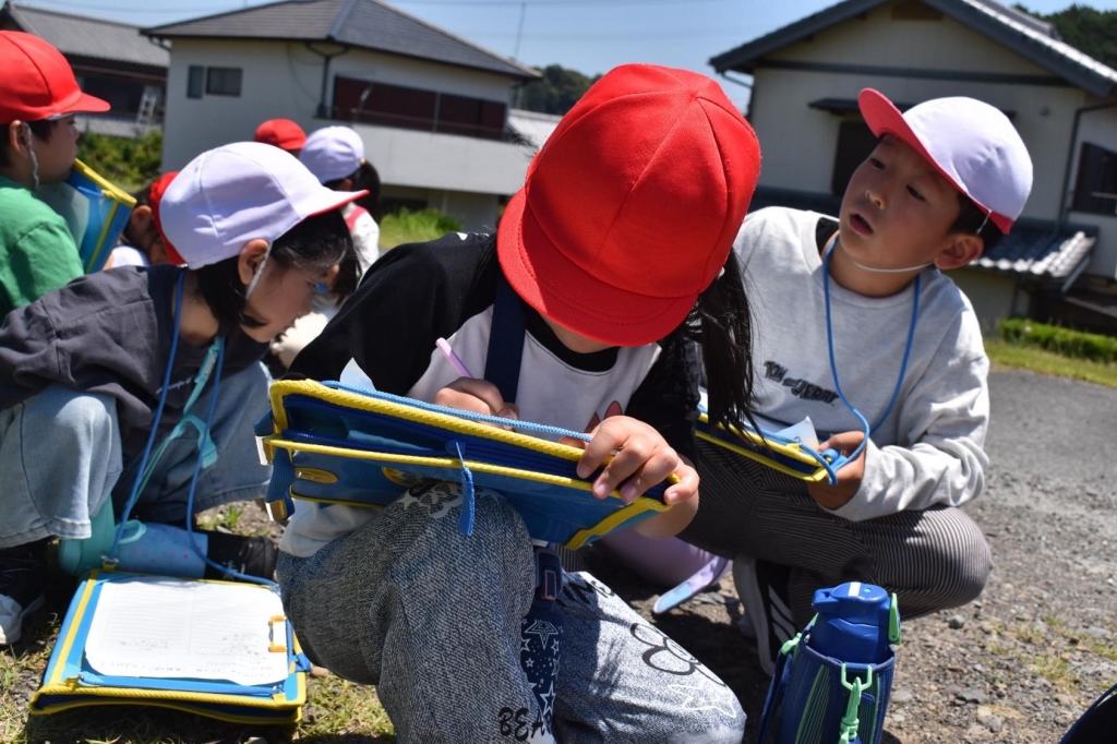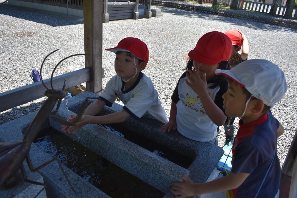 2年生が、生活科の学習で町探検に行きました。山名神社の本殿や手水舎までよく見て調べることで、身近な地域のことをより深く知ることができました。